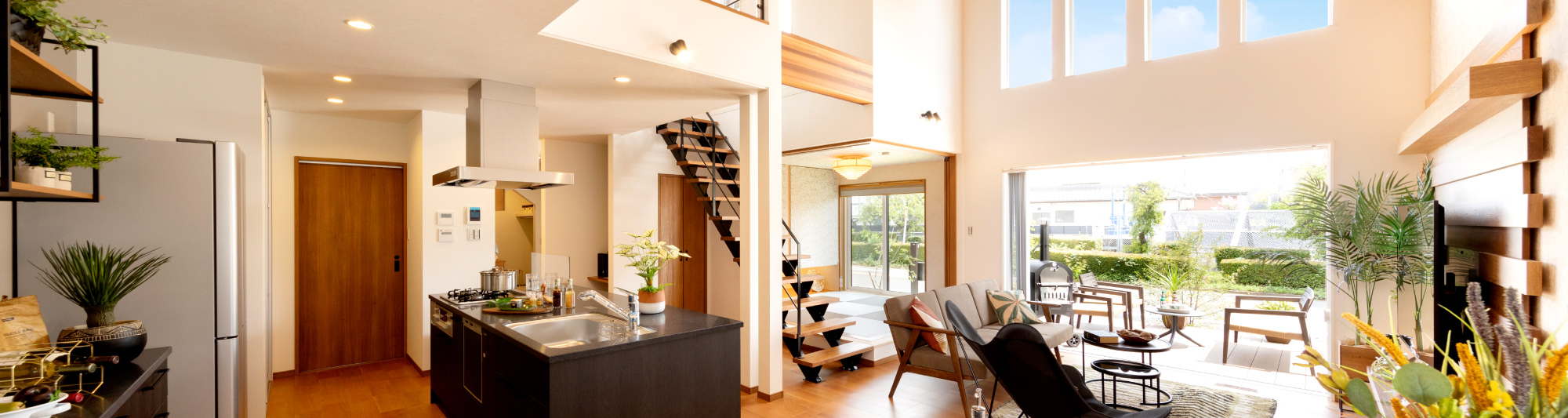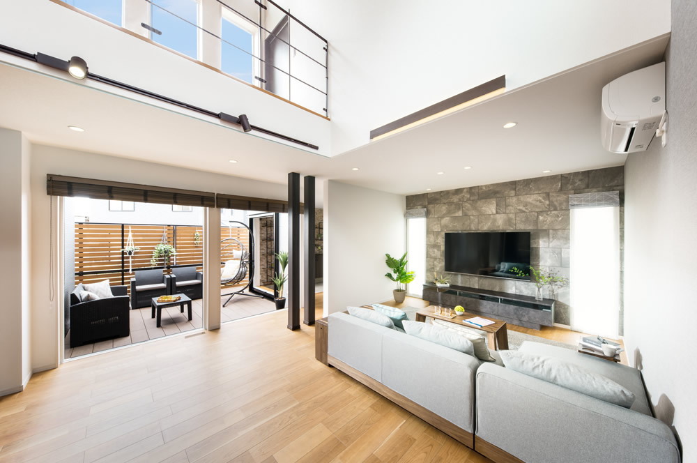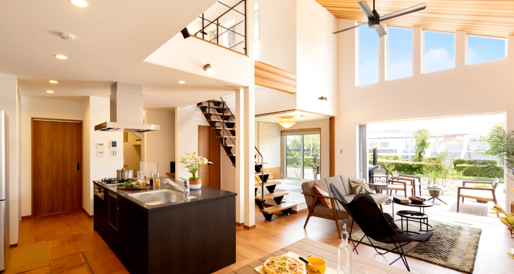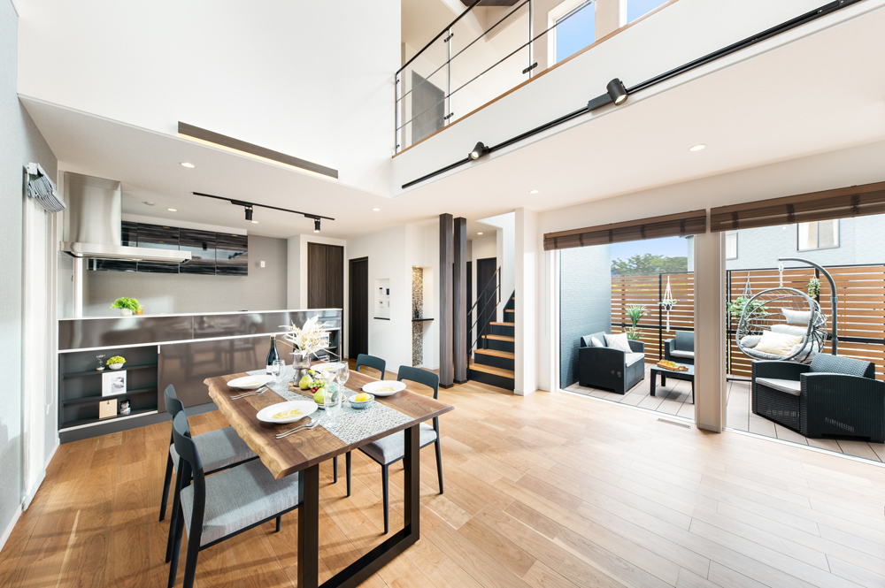 27.6帖の広々空間と大きな吹き抜けのある開放的なLDK。ウッドデッキにも繋がりさらに奥行きも感じられます。