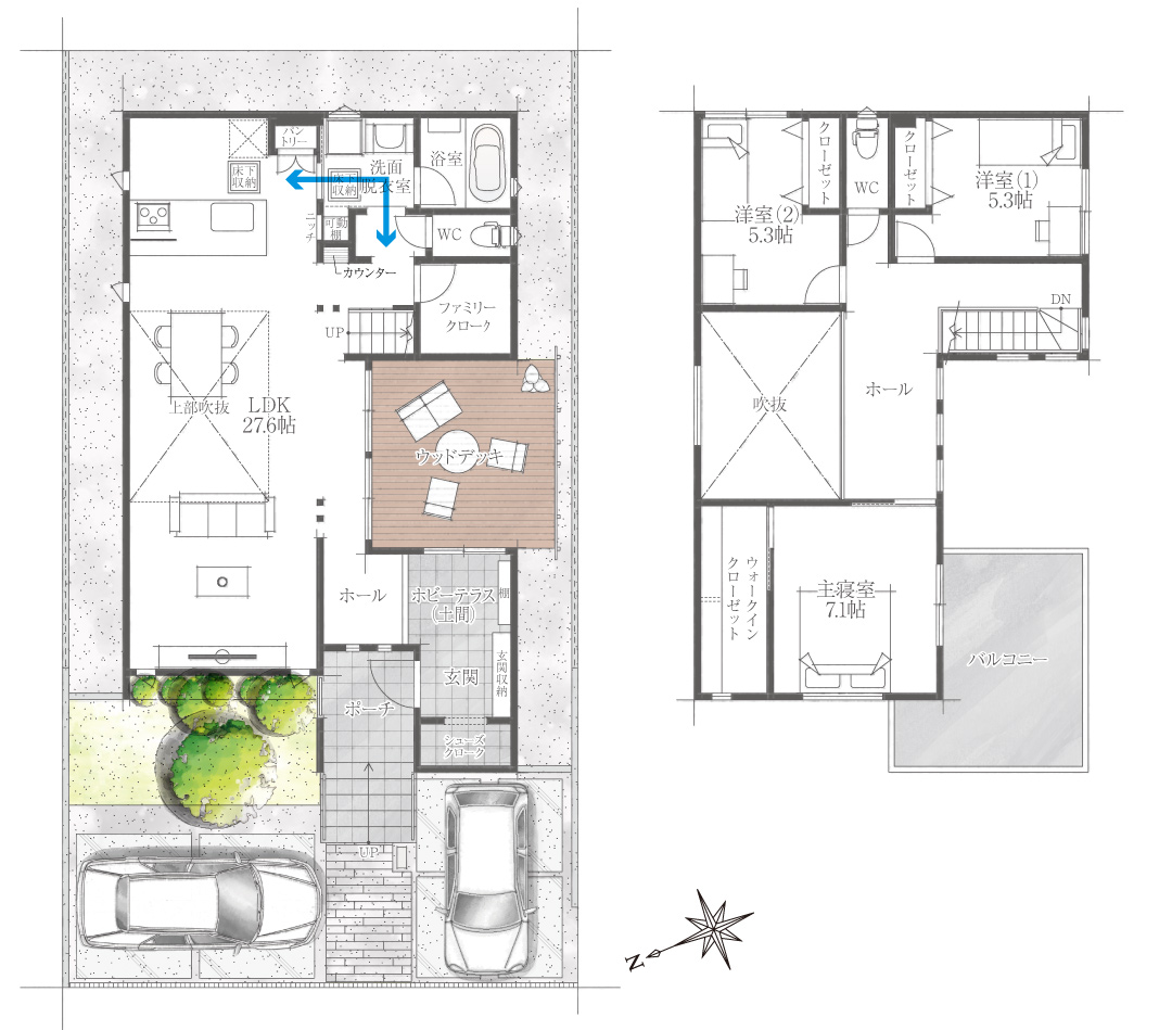 LDKとウッドデッキ、ホビーテラスへとつながる一体感のある開放空間。フレキシブルで自由な使い方ができる導線設計です。